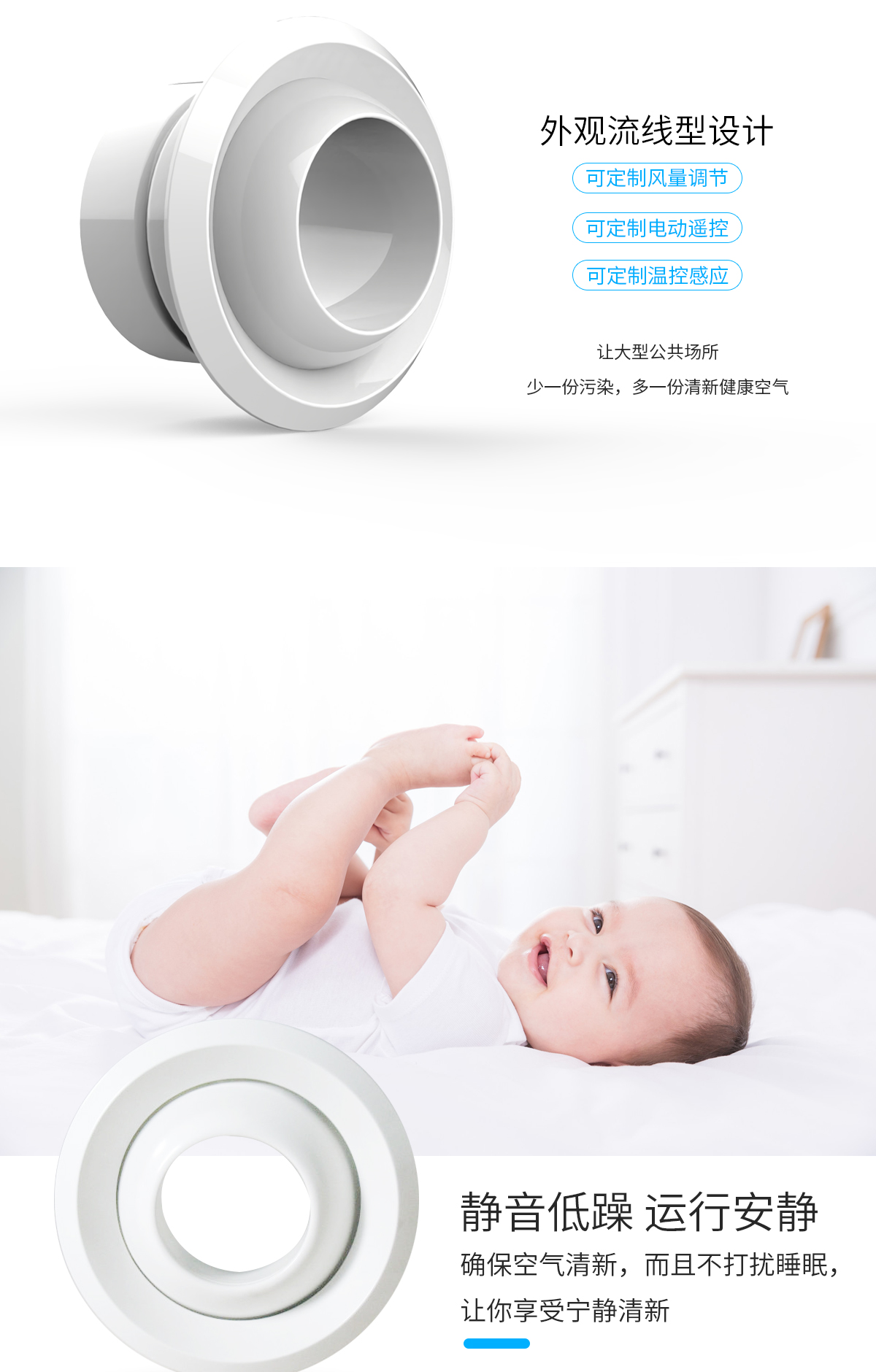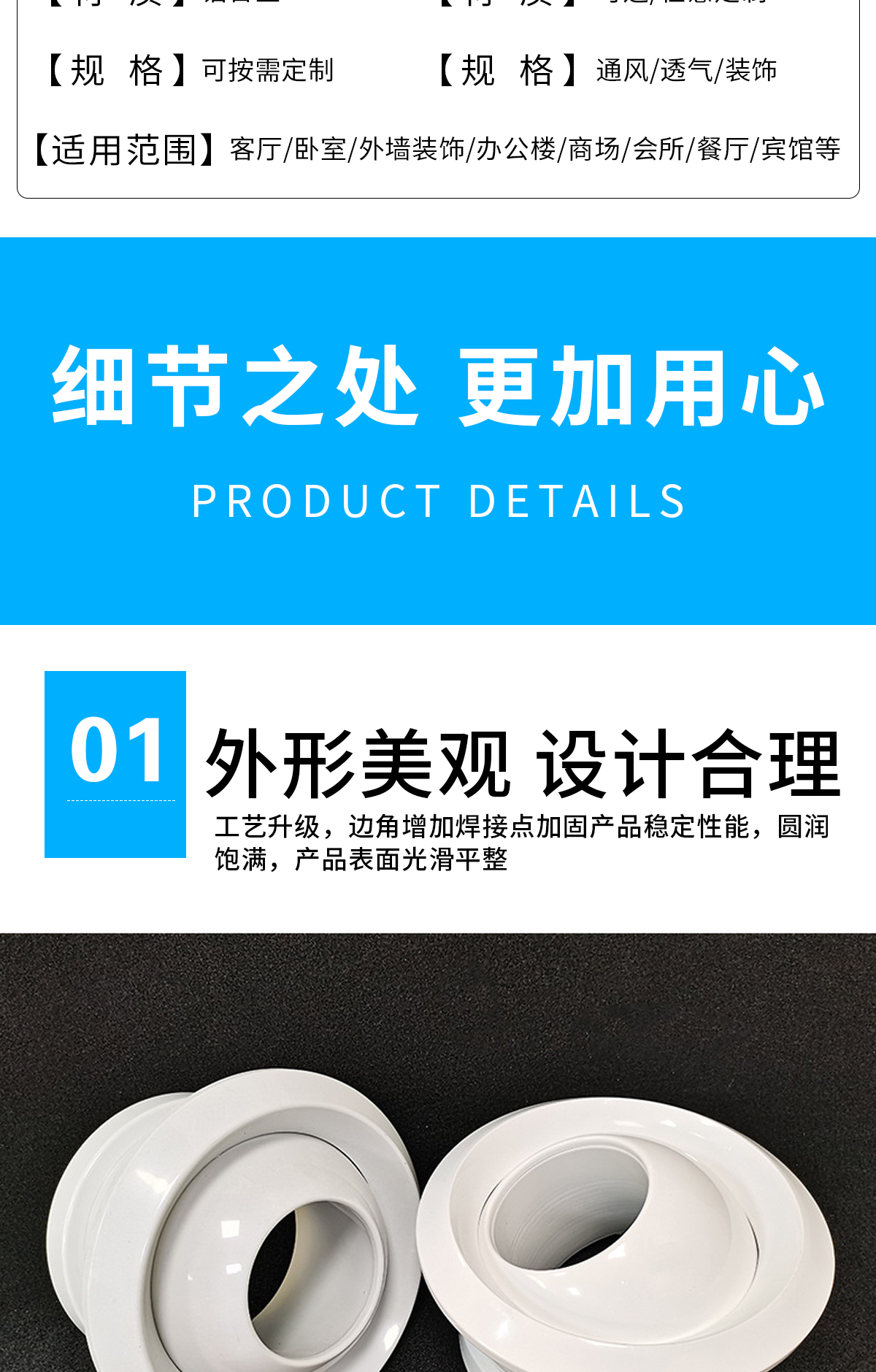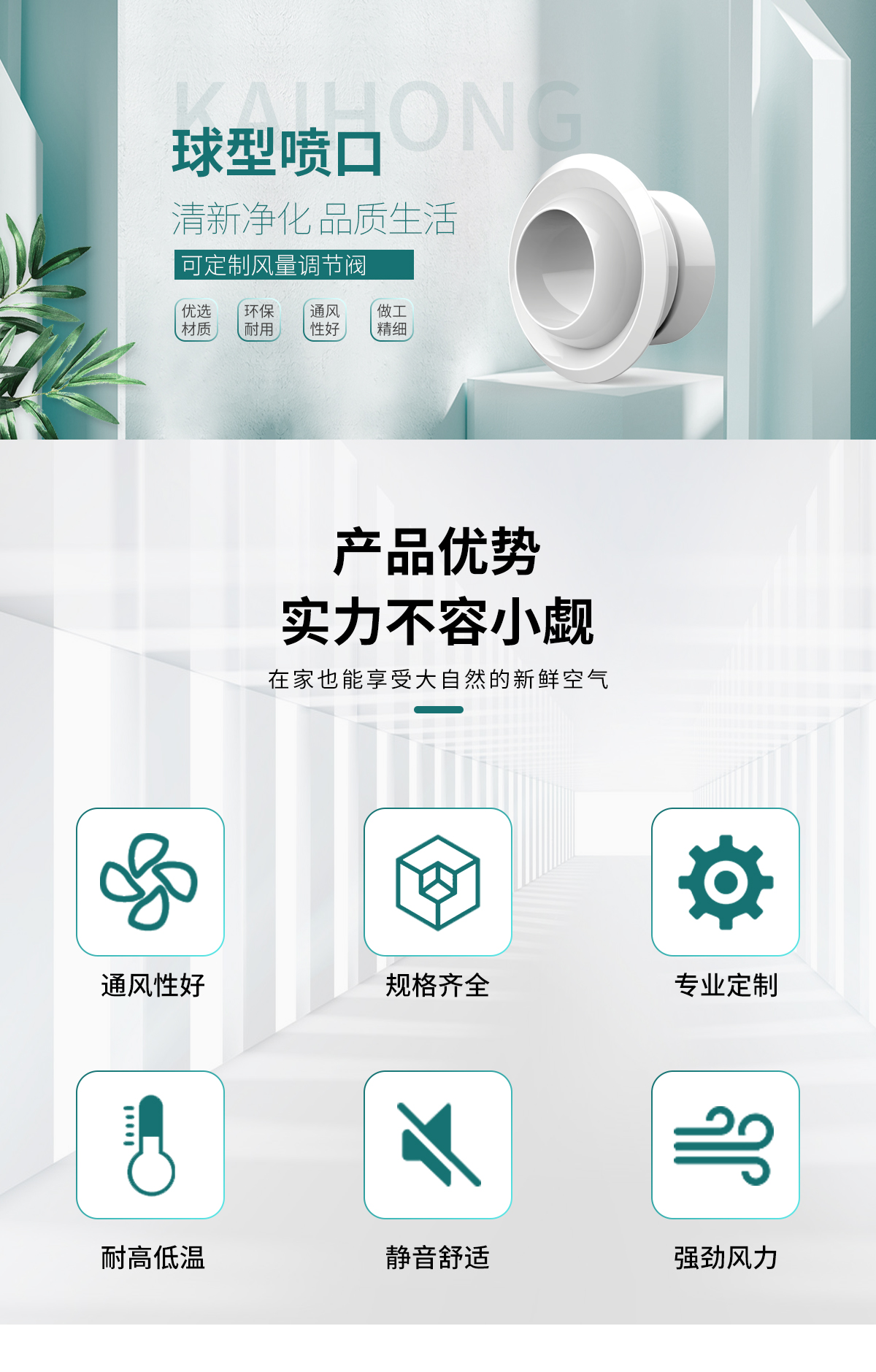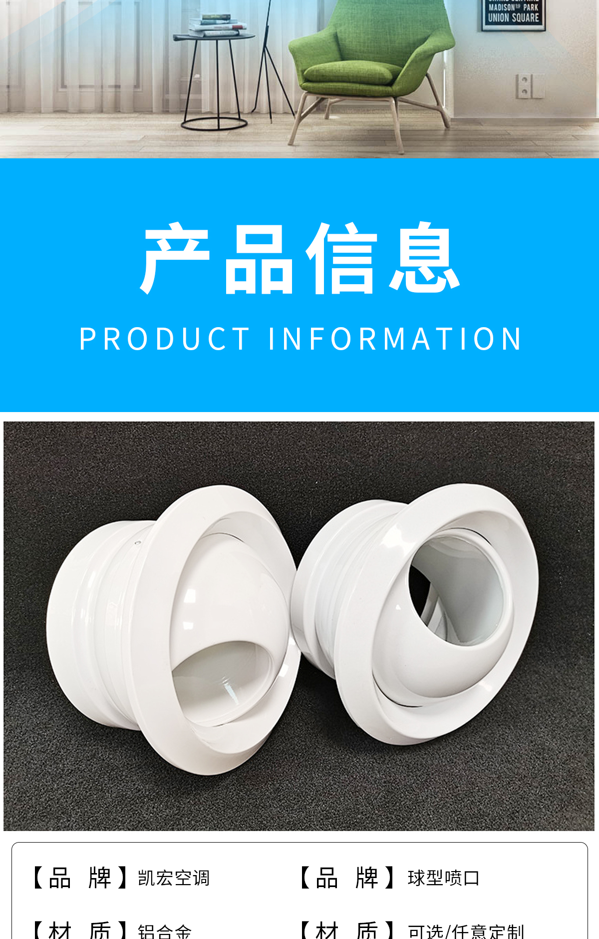 球形噴口可配多葉調(diào)節(jié)閥,在噴口外就可以調(diào)節(jié)風(fēng)量。噴口面板和法蘭為鋁合金,閥體為鍍鋅鋼板